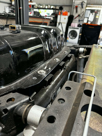 Our weld on bracket kit raises the tank up above the rear crossmember approx 60mm